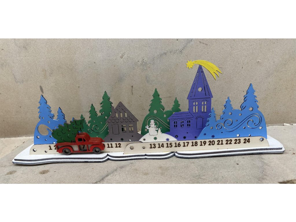 krásny, ručne maľovaný kalendár s posźvnym autičkom. odrátajate dni do Vianoc štýlovo