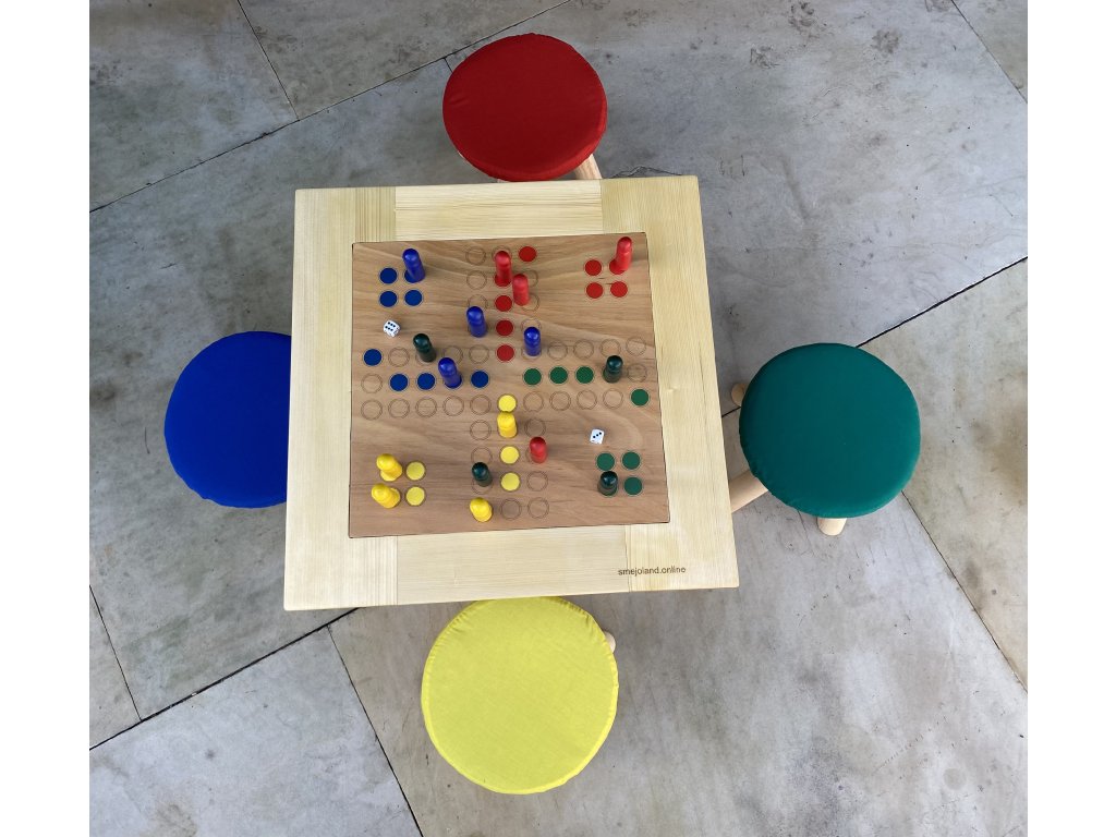 - Hrací plán (doska): Na hracom pláne sú nakreslené farebné cestíčky pre každého hráča, štartovacie oblasti a cieľové domčeky.