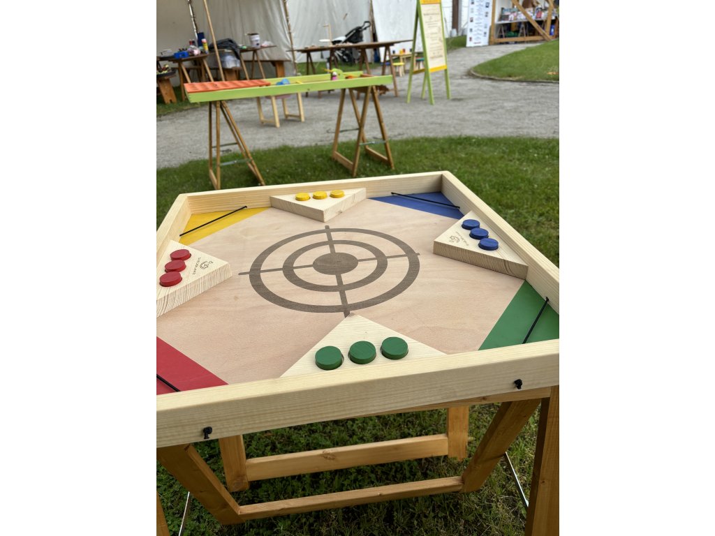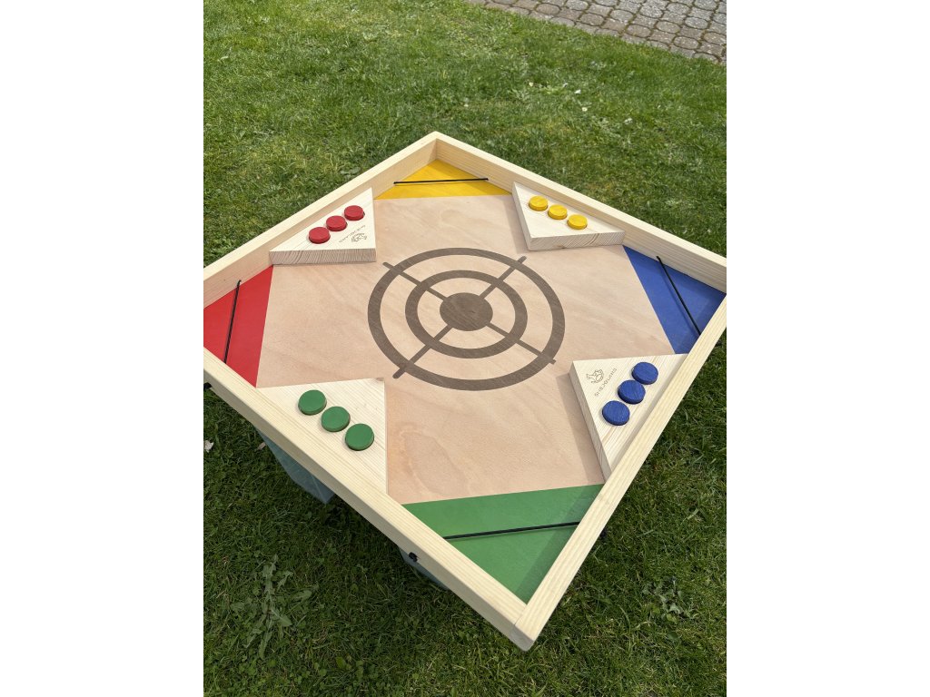 Cieľom hry je pomocou gumičky streliť malý puk do stredu. komu ostane puk najviac v strede vyhrá.